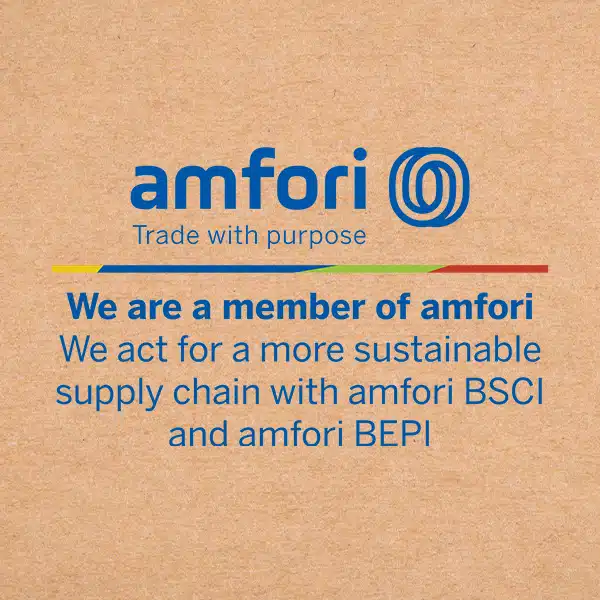 • amfori BSCI (Business Social Compliance Initiative) zorgt ervoor dat de mensen die onze producten maken onder eerlijke en veilige arbeidsomstandigheden werken. Dit betekent onder andere een leefbaar loon, veilige werkplekken en respect voor internationale arbeidsrechten.