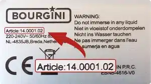 Je vindt het artikelnummer onder anderen op het ratinglabel dat onderop het product zit. Dit label bevat belangrijke informatie, waaronder het artikelnummer in het format XX.XXXX, XX.XXXX.XX of XX.XXXX.XX.XX. Zie de afbeelding hieronder als voorbeeld: