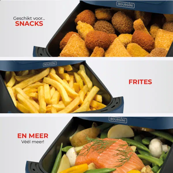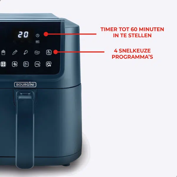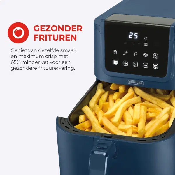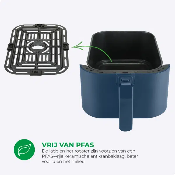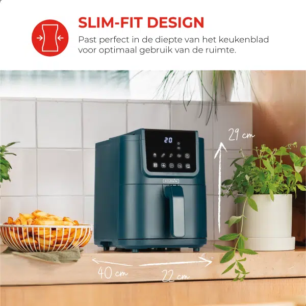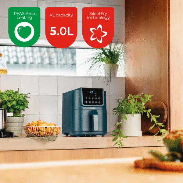 De airfryer beschikt over een instelbare timer tot 60 minuten en een koelblijvend handvat voor extra veiligheid. Met zijn moderne uitstraling, gebruiksgemak en gezonde kookmogelijkheden is de Slimfit Airfryer Pure XL 5L – Blauw – PFAS-vrij een onmisbaar apparaat in iedere keuken.