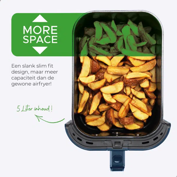 Met een ruime inhoud van 5,0 liter is deze airfryer ideaal voor grote porties, zodat je in รฉรฉn keer een complete maaltijd bereidt. Het slanke en ruimtebesparende ontwerp maakt het apparaat perfect voor ieder aanrecht, zonder in te boeten op capaciteit.