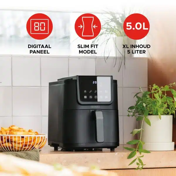 De airfryer beschikt over een instelbare timer tot 60 minuten en een koelblijvend handvat voor extra veiligheid. Met zijn moderne uitstraling, gebruiksgemak en gezonde kookmogelijkheden is de Slimfit Airfryer Pure XL 5L – Zwart – PFAS-vrij een onmisbaar apparaat in iedere keuken.