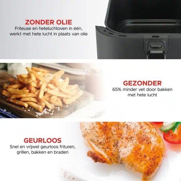 De Slimfit Airfryer Pure XL 5L – Zwart – PFAS-vrij is de perfecte keuze voor iedereen die gezonder wil koken zonder in te leveren op smaak. Dankzij de geavanceerde heteluchttechnologie geniet je van krokante frites, snacks, groenten, vlees en vis met tot 65% minder vet dan bij traditionele frituurmethoden.
