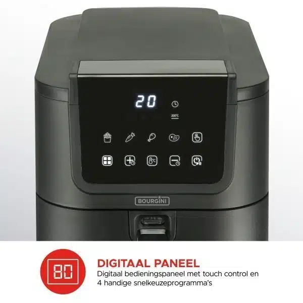 Het digitale bedieningspaneel met touch control biedt vier snelkeuzeprogrammaโs voor frituren, grillen, bakken en braden. Hierdoor bereid je moeiteloos allerlei gerechten met รฉรฉn druk op de knop. De PFAS-vrije keramische anti-aanbaklaag voorkomt dat voedsel blijft kleven, terwijl de vaatwasserbestendige kooklade zorgt voor eenvoudig schoonmaken.