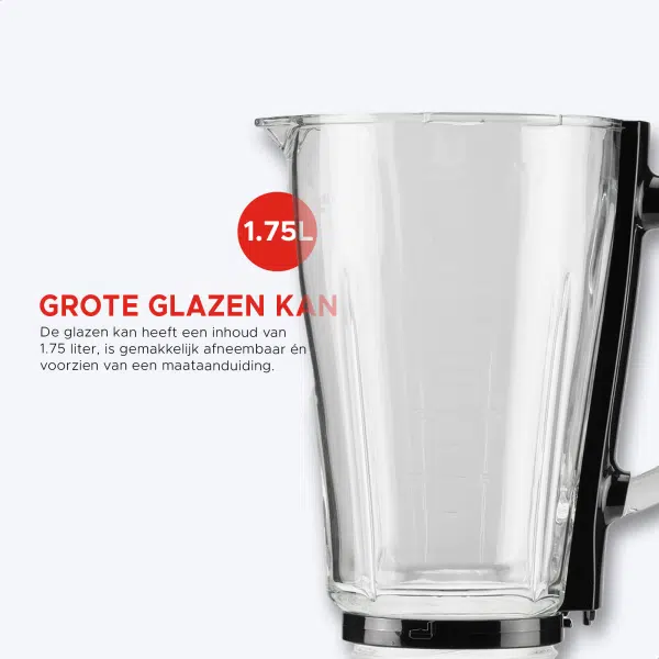 De ruime 1,75 liter mengkan biedt voldoende capaciteit voor grote porties, ideaal voor gezinnen of meal prepping. Met 4 voorgeprogrammeerde snelheden pas je de blender eenvoudig aan op jouw bereiding, terwijl de ijs-crushfunctie zorgt voor perfect gekoelde smoothies en cocktails.