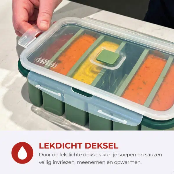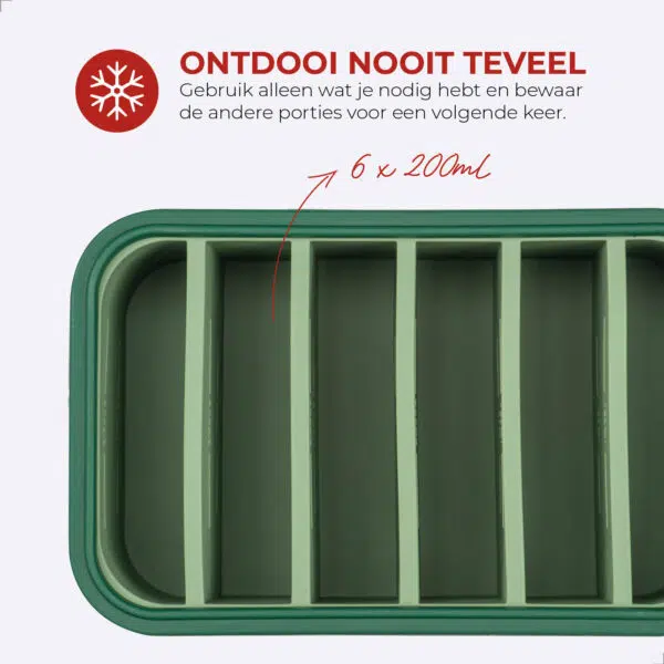 Dit bakje heeft 6 vakjes van 200 ml. Ideaal voor sauzen, dips, fruit, babyhapjes, smoothie ingrediรซnten, toppings en kleine maaltijdbouwstenen. Vries je porties in, druk ze er later eenvoudig uit en warm op wanneer het jou uitkomt. Doordat het bakje van flexibel siliconen is, heb je niet het gedoe van vastgevroren eten dat je er met geweld uit moet peuteren.