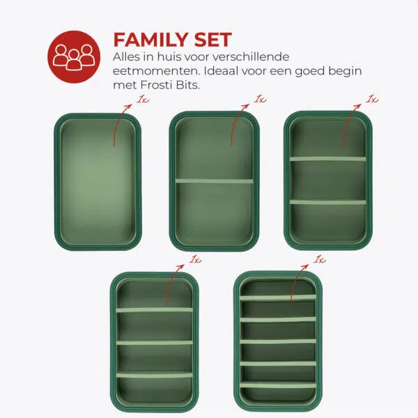De Frosti Bits Familie set is ideaal als je het Frosti Bits systeem goed wilt leren kennen. In deze set zit van elk formaat รฉรฉn bakje, zodat je alle varianten kunt gebruiken en ervaren wat het beste bij jouw huishouden past.