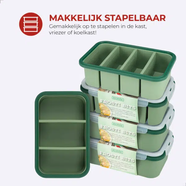 Frosti Bits is opgezet als een modulair systeem met vaste formaten die op elkaar aansluiten. Met de Familie set kun je dit systeem in de praktijk testen. De verschillende bakjes geven je de vrijheid om te variรซren in portiegrootte, indeling en gebruiksmomenten, zonder dat je vooraf hoeft te weten welk formaat jouw favoriet wordt.