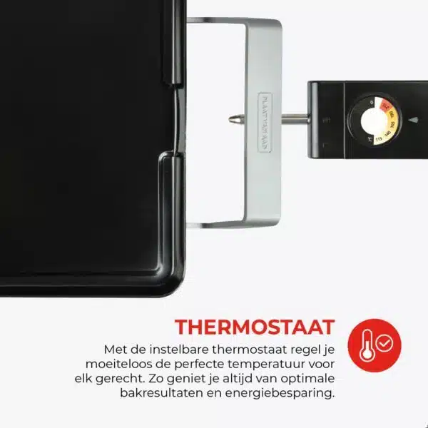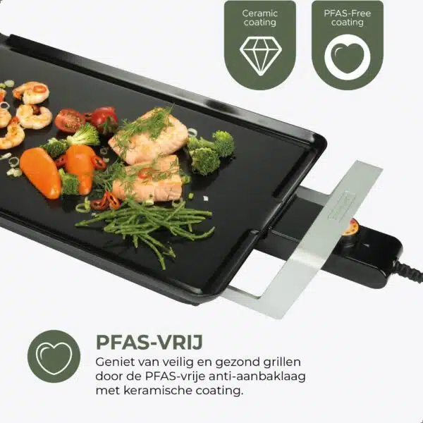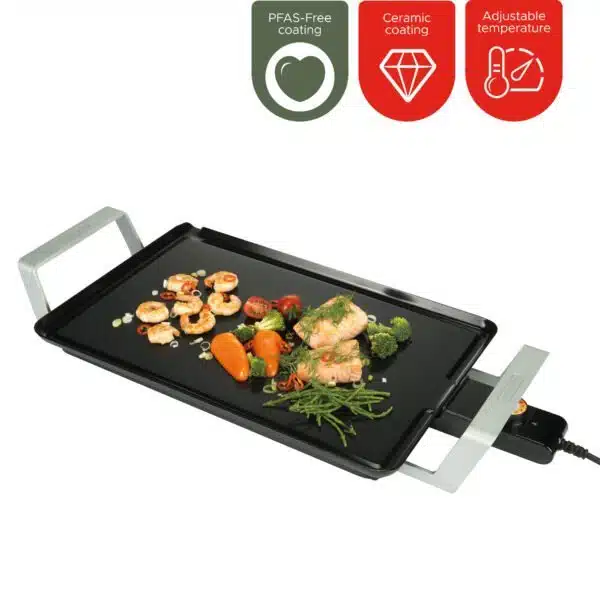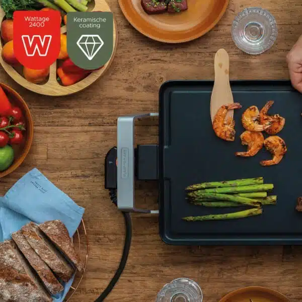 De functionaliteit ondersteunt die rust aan tafel. De dubbele antiaanbaklaag maakt bakken zorgeloos en overzichtelijk; olie of boter is niet nodig en ingrediรซnten laten gemakkelijk los. Met de regelbare thermostaat heb je volledige controle over de temperatuur, zonder dat het koken aandacht opeist. Zo blijft de focus op het samenzijn en niet op techniek of handelingen. De plaat doet wat hij moet doen, betrouwbaar en zonder poespas.