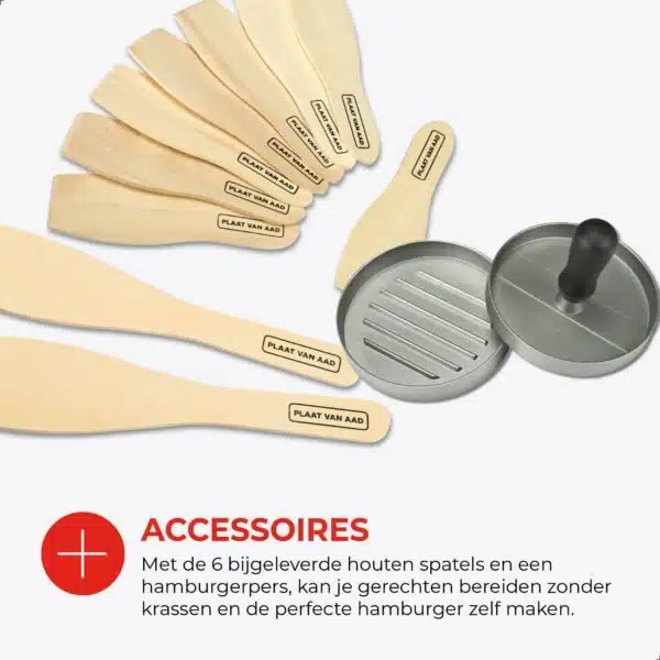 Wat deze uitvoering extra bijzonder maakt, is de complete en verzorgde samenstelling. De stevige opbergkoffer beschermt de plaat en maakt het makkelijk om deze netjes op te bergen of mee te nemen. De meegeleverde hamburgerpers nodigt uit om zelf burgers te vormen en samen te bereiden, terwijl de zes houten spatels prettig in de hand liggen en vriendelijk zijn voor de antiaanbaklaag. Het zijn details die bijdragen aan comfort, zonder de eenvoud te verliezen.
