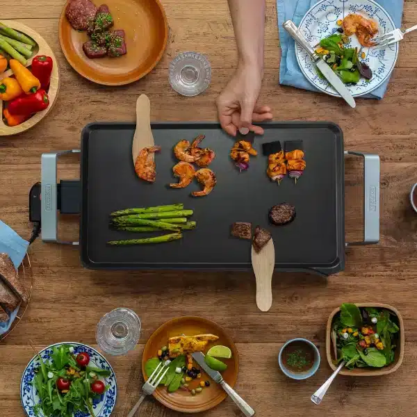 Voor extra gebruiksgemak beschikt de Multi Plate over een vetafvoer met schenktuitje, zodat overtollig vet gemakkelijk verwijderd kan worden. De cool-touch aluminium handgrepen zorgen ervoor dat je de bakplaat veilig kunt verplaatsen.