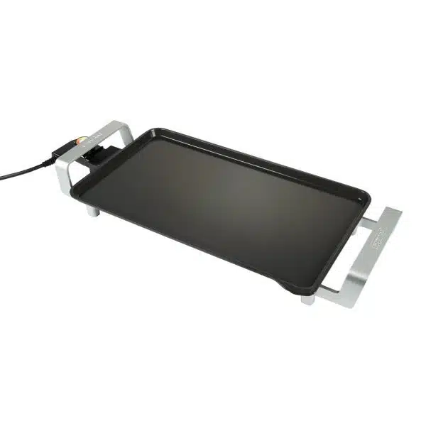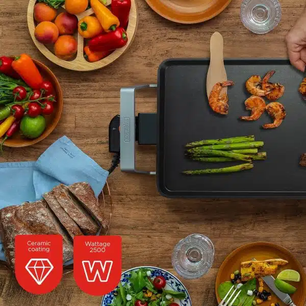 Breng gezelligheid aan tafel met de Multiplate PURE – Bakplaat – 46 x 26 cm – 2500 W – PFAS-vrij. Deze veelzijdige en krachtige elektrische bakplaat is perfect voor het bereiden van vlees, vis, groenten en meer, zonder dat je een traditionele barbecue nodig hebt.
