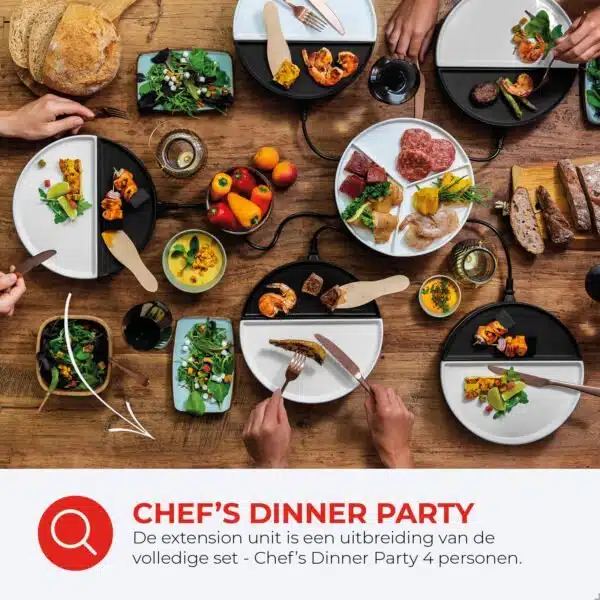 Bereid jouw gourmetervaring uit met de Chef’s Dinner Party – Uitbreidingsset, speciaal ontworpen om meer gasten te laten deelnemen aan het culinaire plezier. Deze set bevat een individuele kook- en eetunit die eenvoudig gebruikt kan worden naast een Chef’s Dinner Party basisset 4 persoons (16.4005.00.00) of 5 persoons (16.4006.00.00). Het biedt je de mogelijkheid om met vijf of meer personen te koken en te eten, zonder dat smaken elkaar beïnvloeden. Dit maakt het ideaal voor gasten met allergieën of dieetvoorkeuren.