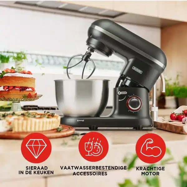 Voor extra stabiliteit is de keukenmachine uitgerust met stevige antislip voetjes, zodat hij stevig op het aanrecht blijft staan, zelfs op hoge snelheden. Daarnaast is de mengkom vaatwasserbestendig, waardoor schoonmaken eenvoudig is.