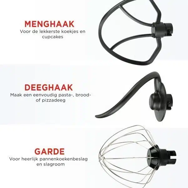De ruime 4,5 liter roestvrijstalen mengkom biedt voldoende capaciteit voor grotere hoeveelheden, ideaal voor het bereiden van taarten, brood of pizzadeeg. De machine wordt geleverd met drie hoogwaardige accessoires: een klopper voor lichte mengsels, een garde voor luchtig kloppen en een deeghaak voor zwaardere degen.