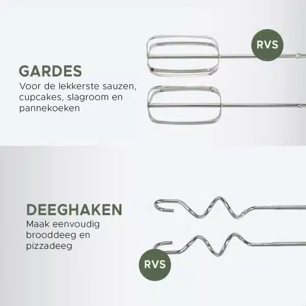Deze handmixer wordt geleverd met 2 RVS gardes en 2 RVS deeghaken, perfect voor het mixen van beslag, kloppen van room of kneden van deeg. Alle accessoires zijn vaatwasserbestendig, zodat schoonmaken snel en eenvoudig gaat.