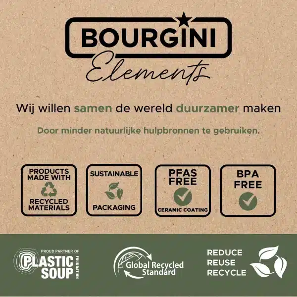 Met Bourgini Elements kies je bewust voor duurzaamheid. Elk product is vervaardigd van GRS-gecertificeerde, gerecyclede materialen en wordt ethisch en verantwoord geproduceerd volgens amfori BSCI- en BEPI-normen. Bovendien draag je bij aan de strijd tegen plasticvervuiling, doordat Bourgini per verkocht Elements-product doneert aan de Plastic Soup Foundation. Zelfs de verpakking is milieuvriendelijk: FSC-gecertificeerd, plasticvrij en bedrukt met plantaardige inkt. Een bewuste keuze voor jouw keuken én het milieu.