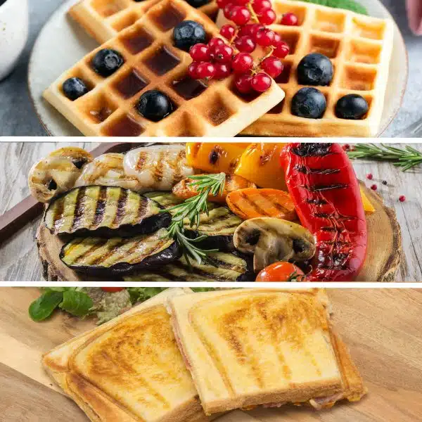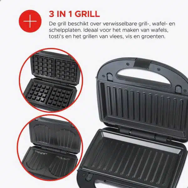 Ontdek de veelzijdigheid van de Multi Grill 3-in-1, een compact keukenapparaat dat fungeert als tosti-ijzer, contactgrill en wafelijzer. Met drie eenvoudig verwisselbare platen bereid je moeiteloos diverse gerechten, van knapperige tosti’s en smakelijke panini’s tot perfect gegrilde vlees- en groentegerechten.
