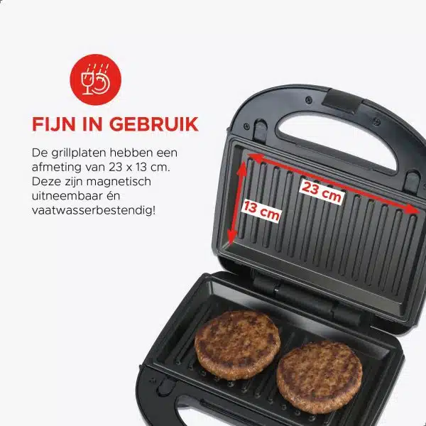 De platen hebben een afmeting van 23 x 13 cm en zijn voorzien van een PFAS-vrije anti-aanbaklaag, wat zorgt voor gezonder koken zonder overtollig vet. Na gebruik kunnen de platen eenvoudig worden gereinigd in de vaatwasser, wat het onderhoud minimaal maakt.