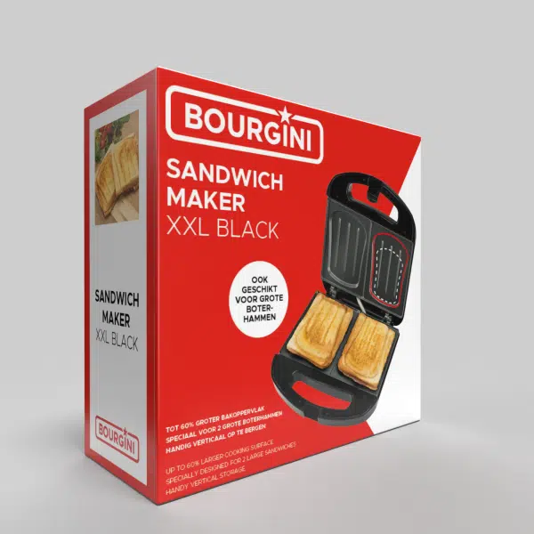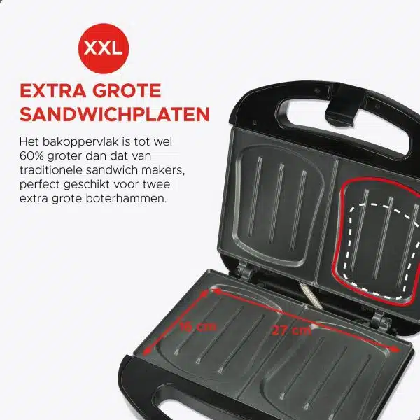 Met de Sandwich Maker XXL maak je in een handomdraai heerlijke, extra grote tostiโs. De bakplaten van dit apparaat zijn maar liefst 60% groter dan die van standaard tosti-ijzers, waardoor ook grote boterhammen moeiteloos passen. Dit maakt het ideaal voor iedereen die van goed gevulde, royale tostiโs houdt.