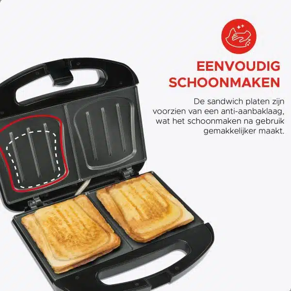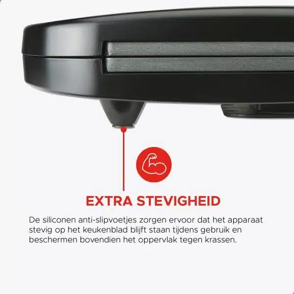De ingebouwde thermostaat zorgt voor een gelijkmatige verhitting, zodat je tostiโs altijd perfect goudbruin en knapperig zijn. Dankzij de koelblijvende handgrepen en de antislipvoetjes is het apparaat veilig en stabiel in gebruik. Na gebruik is het tosti-ijzer eenvoudig schoon te maken dankzij de antiaanbaklaag op de platen.